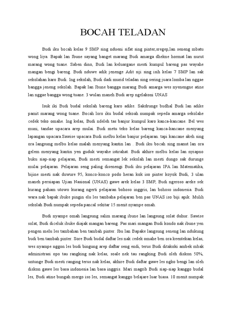 Masio pak Rudi iku guru basa jawa sing trendy lan senengane nglucu bocah-bocah wis ora ketulungan ora gatekake amarga panas sing nyengak iki. Download Soal Try Out USBN SD IPA Paket 1-8 13. Sesuke pas Minggu Purwanti dijak dolan nyang Budianto nginep nyang Sarangan wong jenenge ae nyang hotel opo maneh lek ora njajal nuthuk tahu ndolopo Purwanti dijak nginep telung ndino sedino peng telu Budianto lek ngempakne sentolope nganti Purwanti pengen mlaku perih rasane bocah loro enak-enak neng hotel dene wong tuwane Purwanti bingung ra.